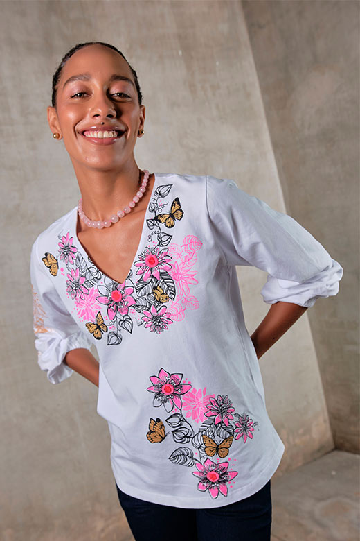Nuestra blusa Monarca, confeccionada en suave algodón orgánico, es una oda a la belleza de las mariposas. La ilustración en tonos fucsia, dorado y negro, combinada con su silueta de corte recto y cuello en V, crea un look sofisticado y femenino. La manga con puño recogido te permite personalizar tu estilo, ya sea llevándola larga o al codo.