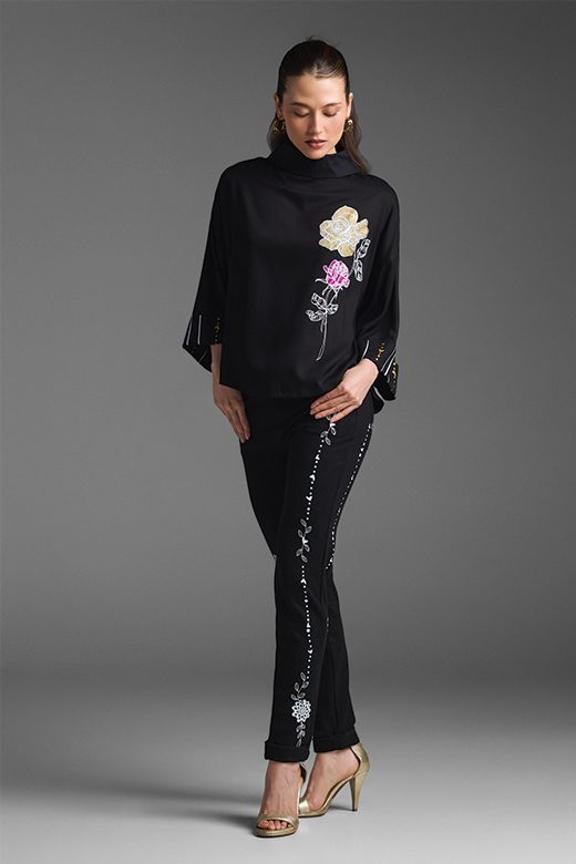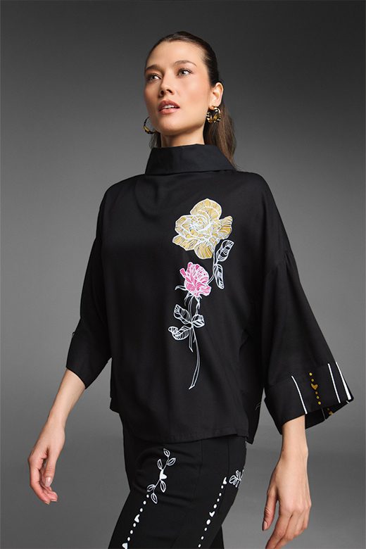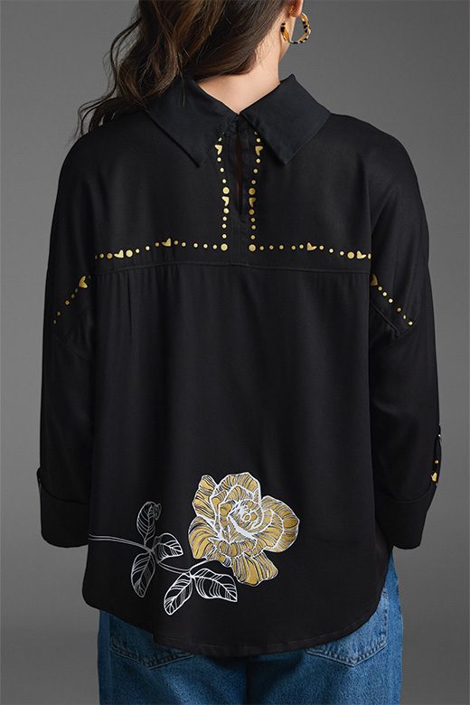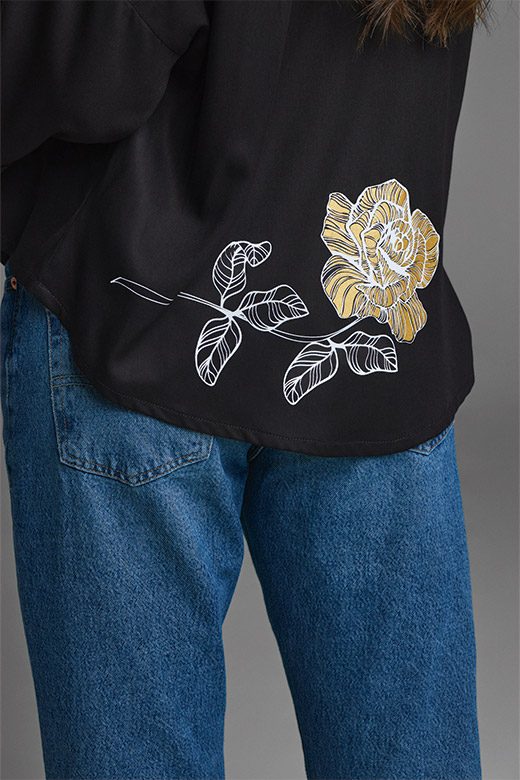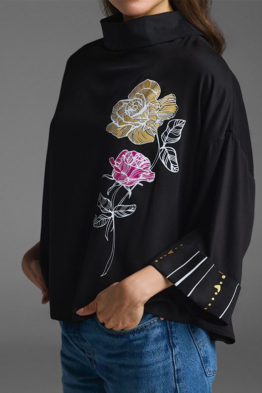 La Blusa Roseta es una pieza única que combina un estilo relajado con un toque sofisticado. Su diseño se inspira en el concepto «The backward shirt», con un cuello que crea un detalle sutil en la espalda. Con su silueta amplia, hombros caídos y puño ancho, te da un look moderno y cómodo. El corte es ligeramente más largo en la parte de atrás para un acabado elegante. El diseño de rosas en serigrafía, en tonos de blanco, dorado y fucsia, te invita a celebrar tu belleza. Combínala con pantalones ajustados o de bota recta para cualquier ocasión, desde reuniones formales hasta eventos especiales.