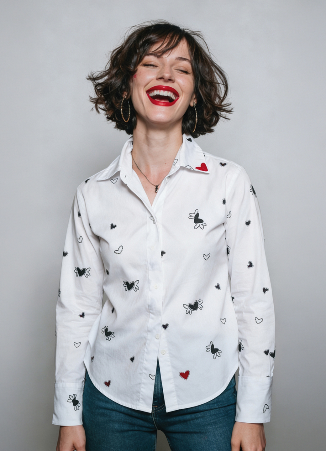 **Nota sobre tu prenda: Al utilizar serigrafía continua, el patrón de corazones de la Camisa RITMO nunca se repite exactamente igual. Esto convierte a tu camisa en una edición exclusiva donde el azar diseña tu propio estampado. Eso sí, el icónico aplique rojo en el cuello siempre estará allí, impecable y en el mismo lugar.