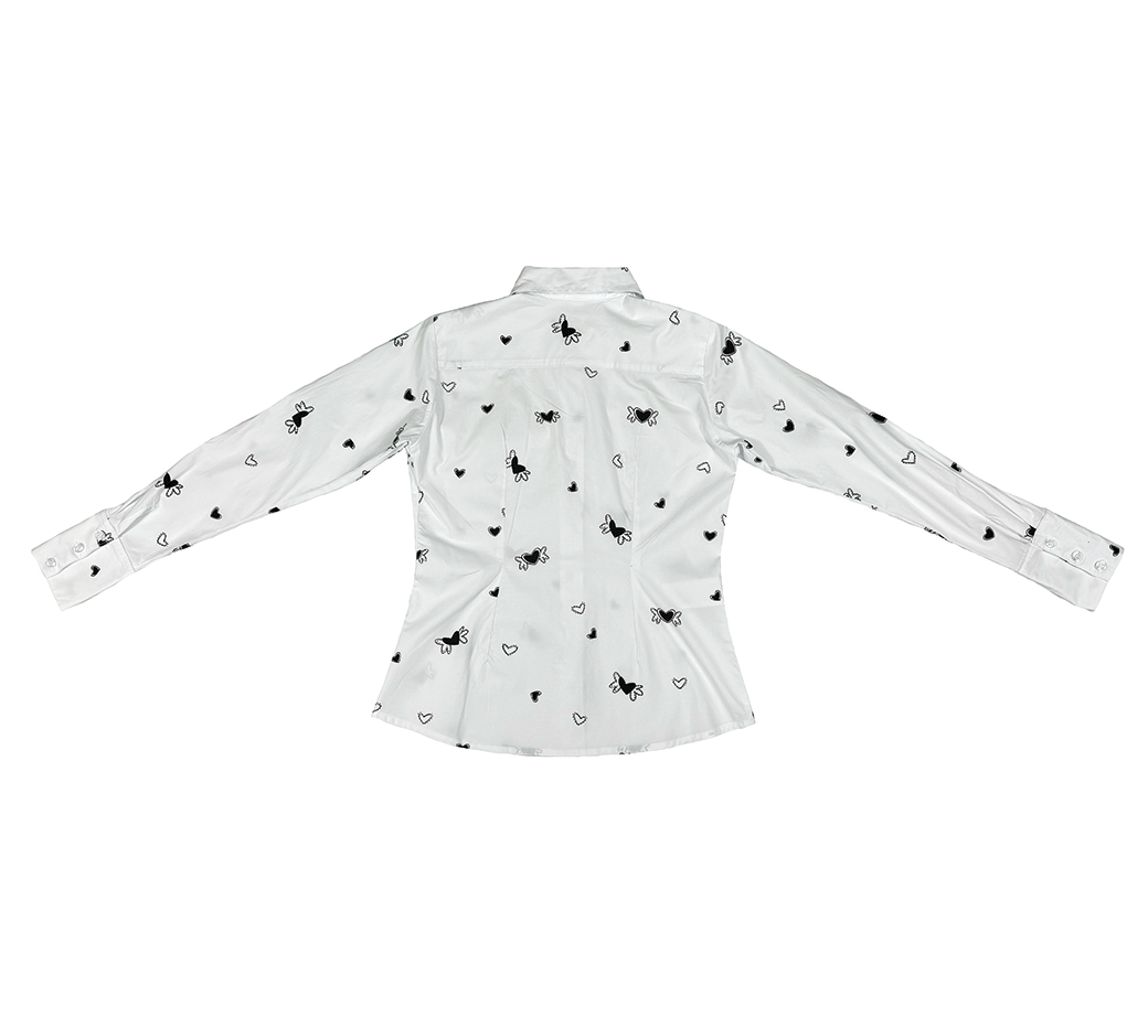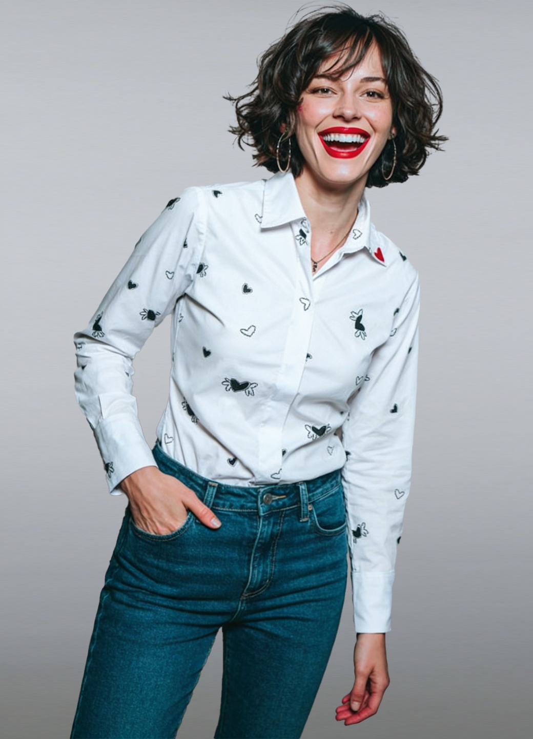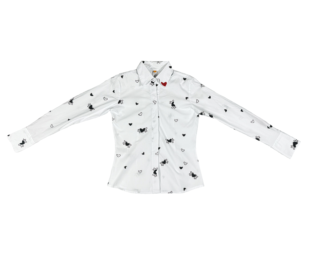 La camisa RITMO es una pieza clásica y siempre vigente. Camisa de manga larga en popelina de algodón blanco. Un diseño que combina comodidad y vanguardia gracias a su estampado de micro-corazones negros y su distintivo aplique rojo en el cuello. Disfruta de la comodidad y el ajuste perfecto de su suave tejido de algodón y spandex. Una prenda esencial que no puede faltar en tu armario.