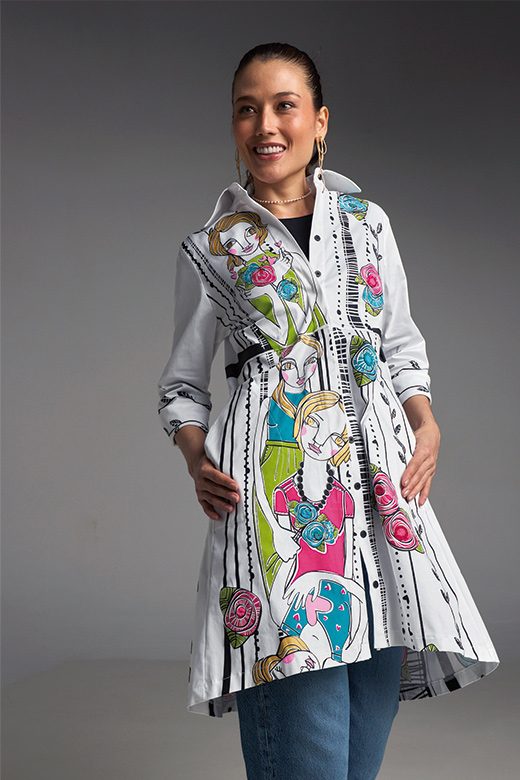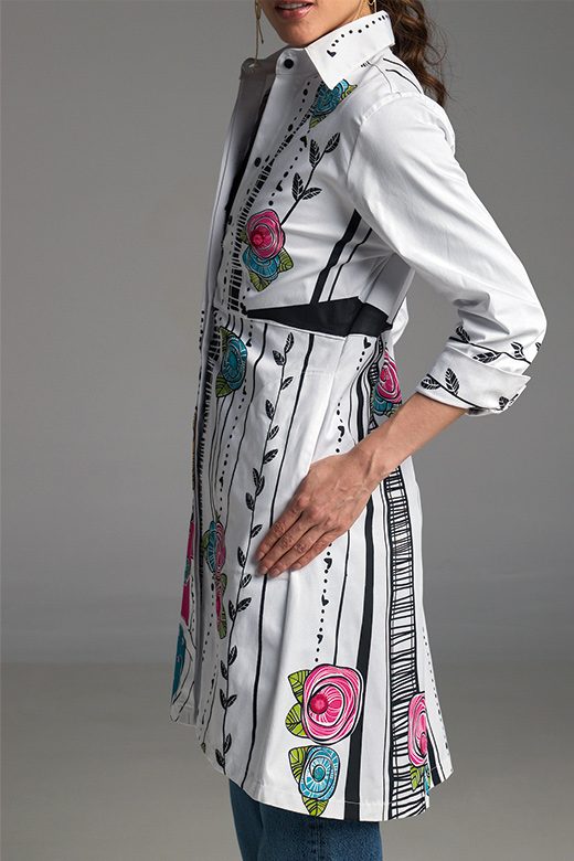 Su estampado, lleno de vibrantes mujeres, flores y líneas negras, le da un toque divertido y artístico, ideal para cualquier ocasión. La comodidad está garantizada con sus prácticos bolsillos laterales.