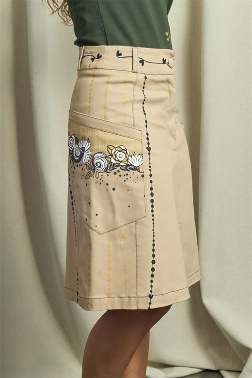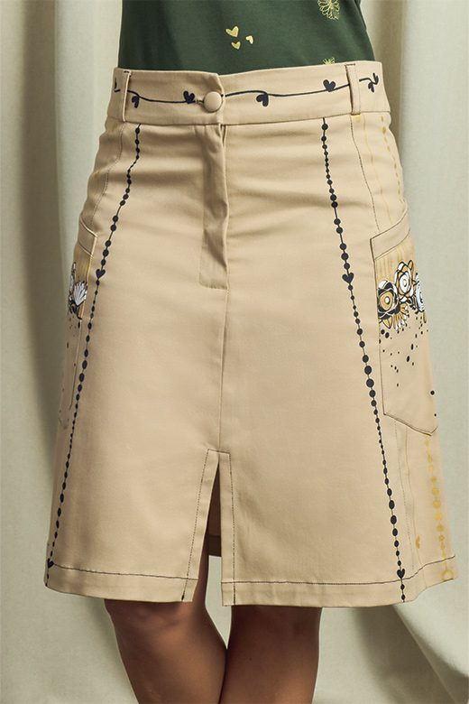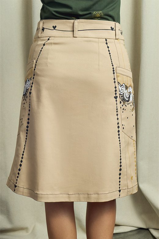 Es la falda corta ideal para cualquier aventura, adornada con una delicada ilustración de flores sobre un clásico color caqui. Pero lo que realmente la hace irresistible son sus prácticos bolsillos laterales