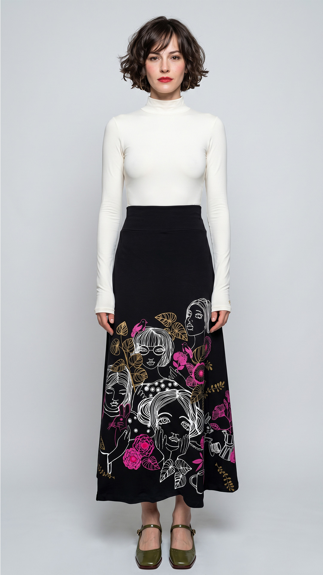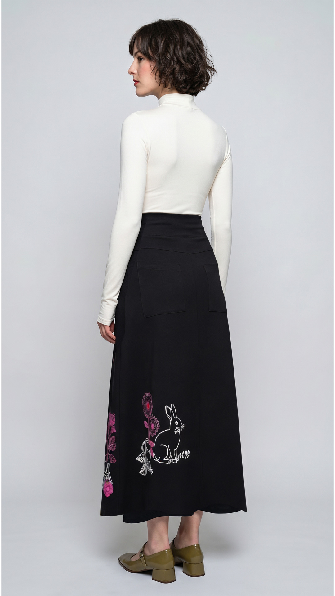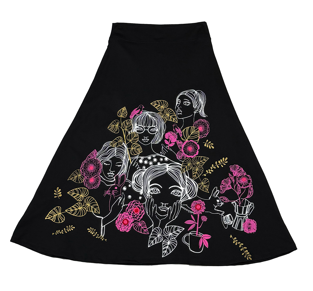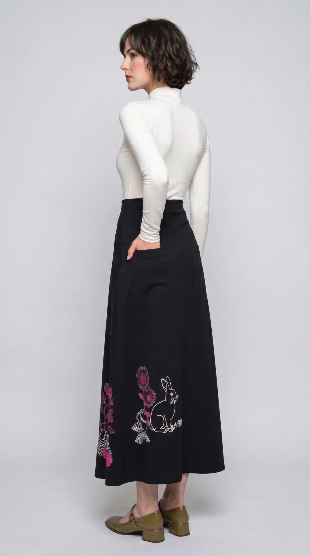 FALDA TERTULIA, Elegancia y confort en una sola pieza. La Falda Tertulia es una maxi falda de tiro medio confeccionada en tejido de punto negro que destaca por su textura y caída fluida. Dos bolsillos de parche discretos en la parte trasera para un acabado limpio y funcional.